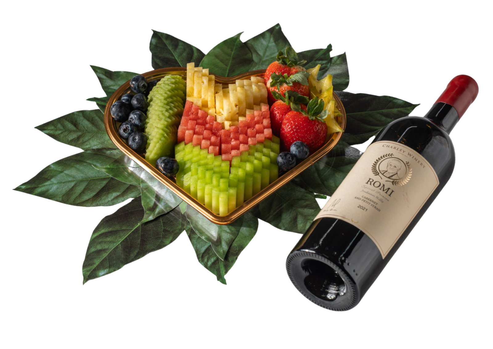 Love & Fruit – מגש פירות בצורת לב עם יין