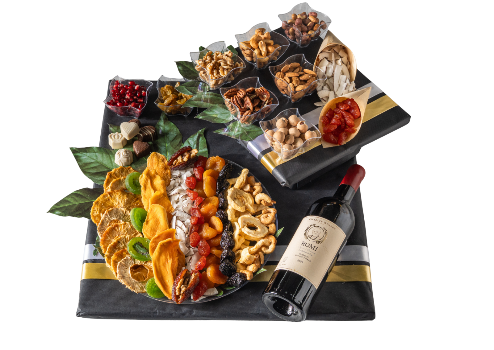 מגש פרימיום מלכותי – פירות, יין, פרלינים ופיצוחים