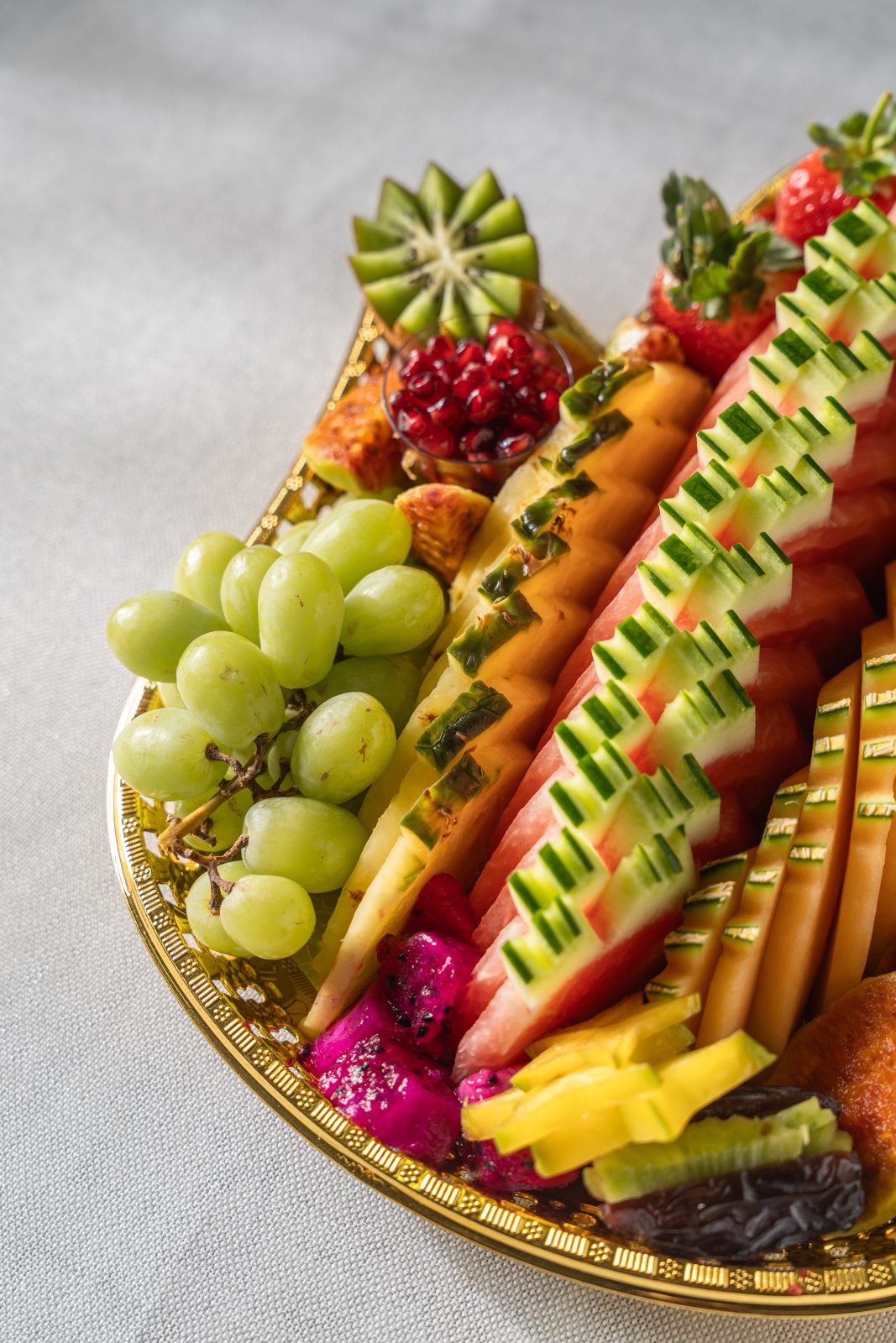 מגש מוזהב בצורת חמסה המעוצב במיוחד לאירועי חינה ומסיבות מסורתיות ומשלב שפע של פירות העונה טריים וחתוכים בדיוק אמנותי המגש המרהיב משמש כמרכז שולחן עוצר נשימה בטקסי חינה או כמתנה מרשימה וסמלית לארוחת חג אצל המשפחה המביאה איתה איחולי הצלחה ומזל טוב. הבחירה במגש החמסה מבטיחה שדרוג משמעותי לכל שולחן אירוח ומעניקה לאורחים חוויה קולינרית רעננה ובריאה שכולה סטייל וברכה.