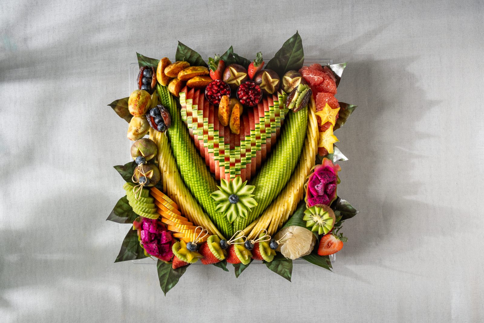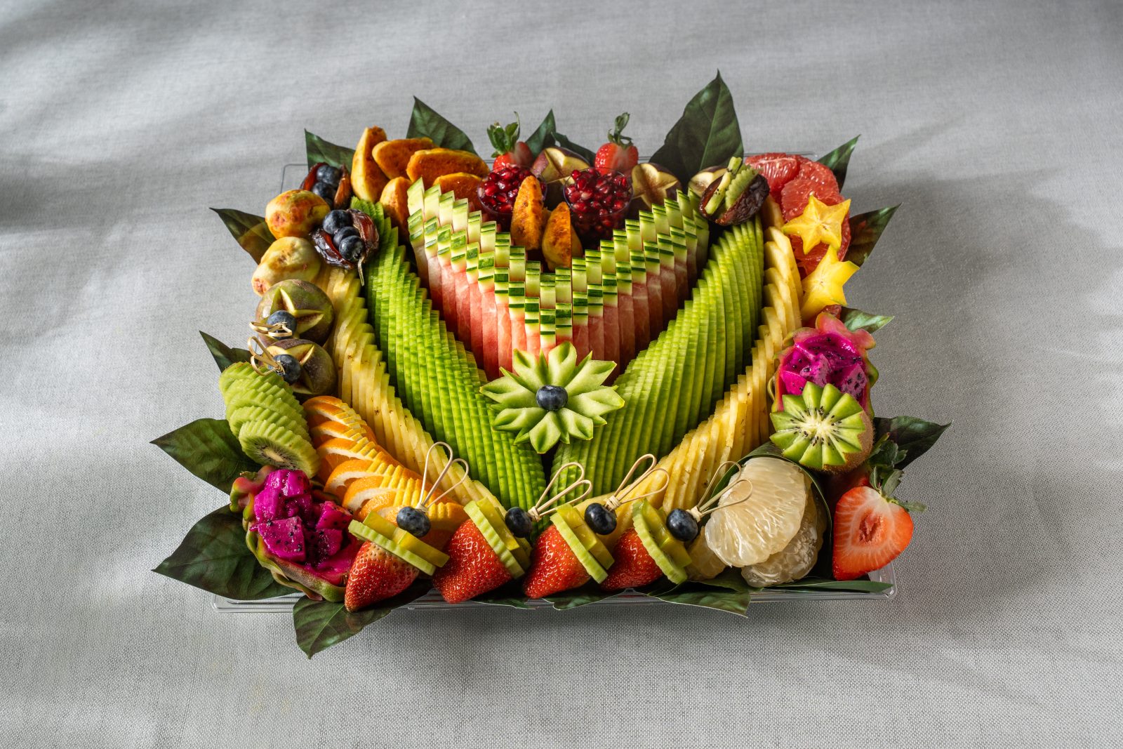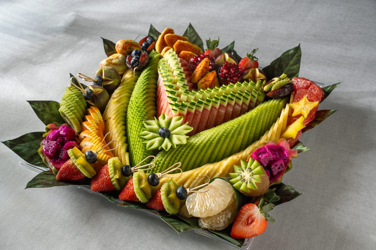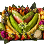 מגש פירות יוקרתי בצורת ריבוע גדול, עם חיתוך סימטרי ומדויק של פירות העונה שיוצרים מראה עשיר וצבעוני שמושך את העין מיד. המגש עמוס בפירות פרימיום טריים וכולל כ-12 מינים המונחים בקפידה על מצע עלים טבעי המעניק לו מראה רענן ויוקרתי במיוחד. מדובר בבחירה המושלמת כמרכז שולחן מרשים לאירועים חגיגיים או כמתנה יוקרתית שמשדרת שפע והשקעה, כזו שמשאירה רושם עמוק על כל מי שמקבל אותה. השילוב בין הדיוק האמנותי בחיתוך לבין האיכות הבלתי מתפשרת של הפירות הופך כל טעימה לחוויה קולינרית מענגת שמעלה את רמת האירוח שלכם בכמה דרגות.